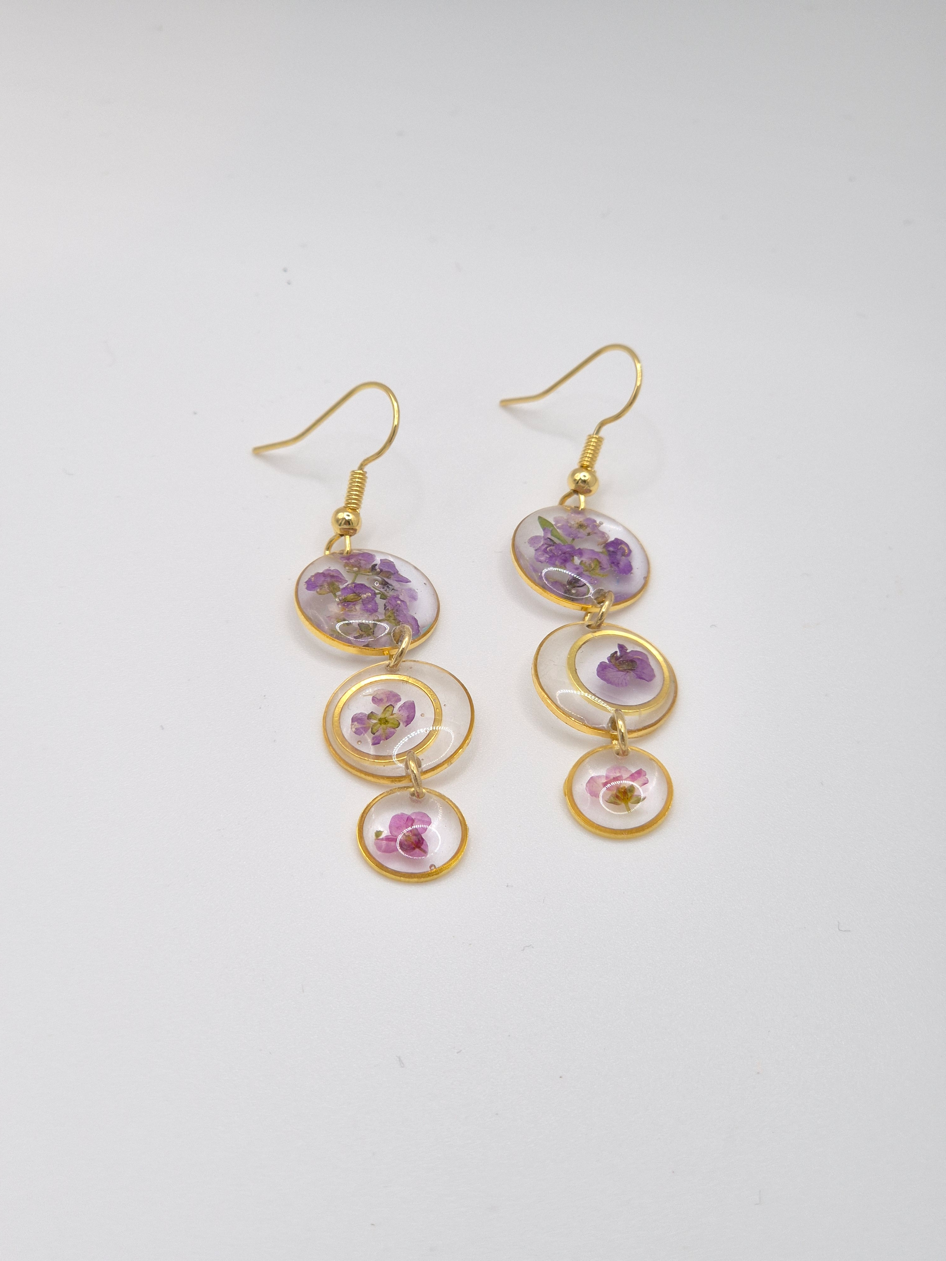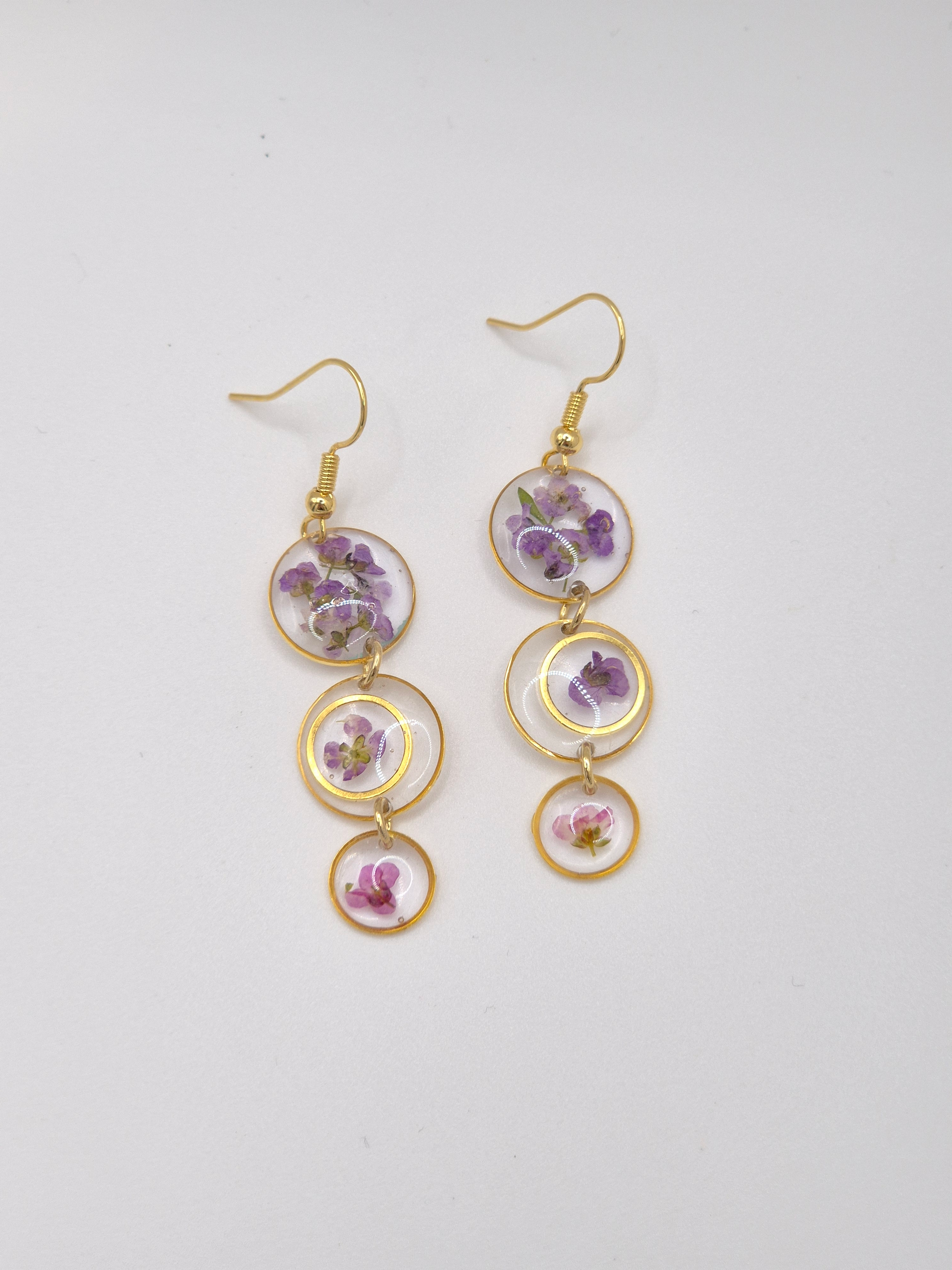 These purple, pink and yellow Alyssums set in various circular shaped bezels with an 18k Gold Plated hook and finished with a unique style.