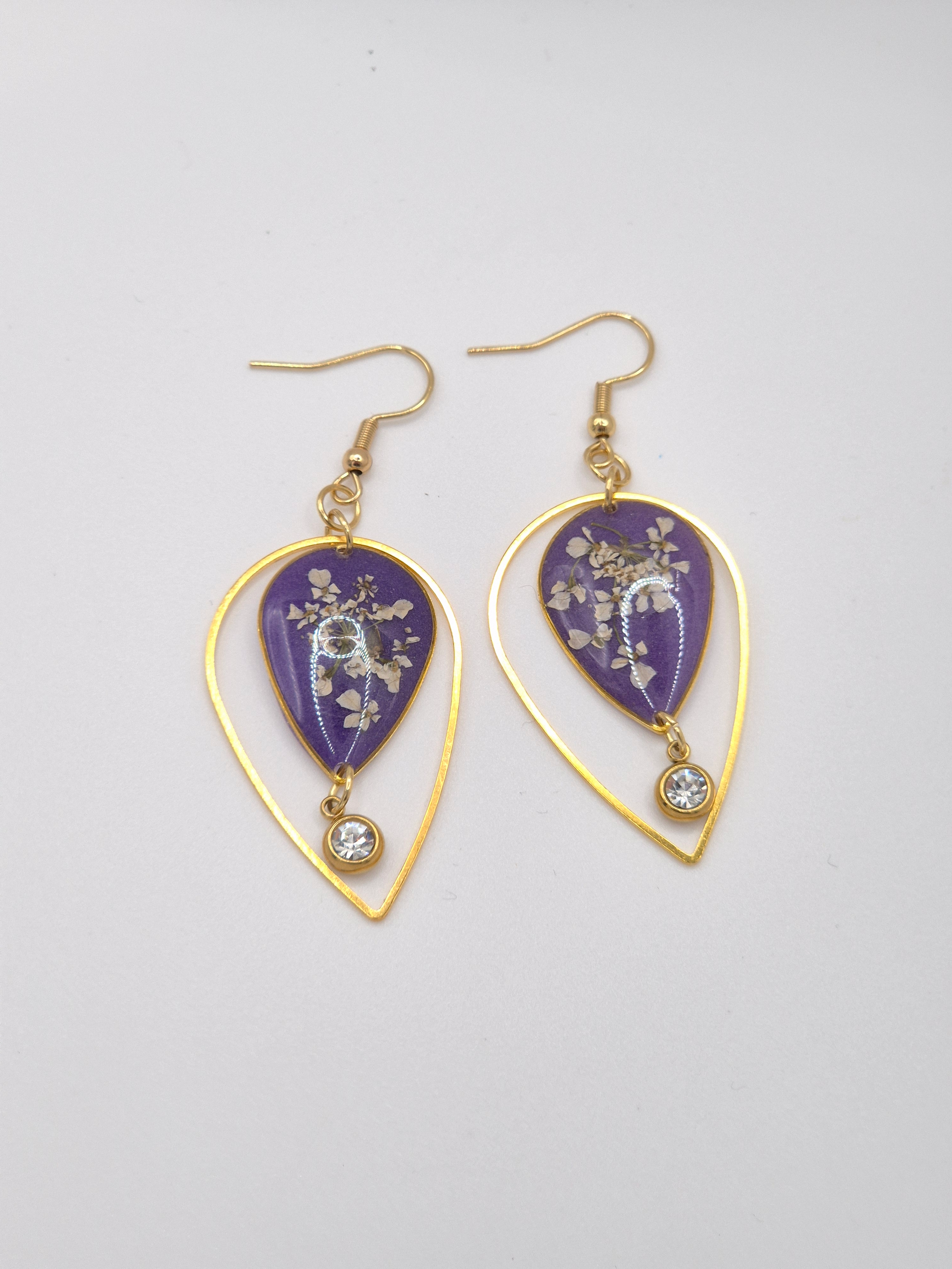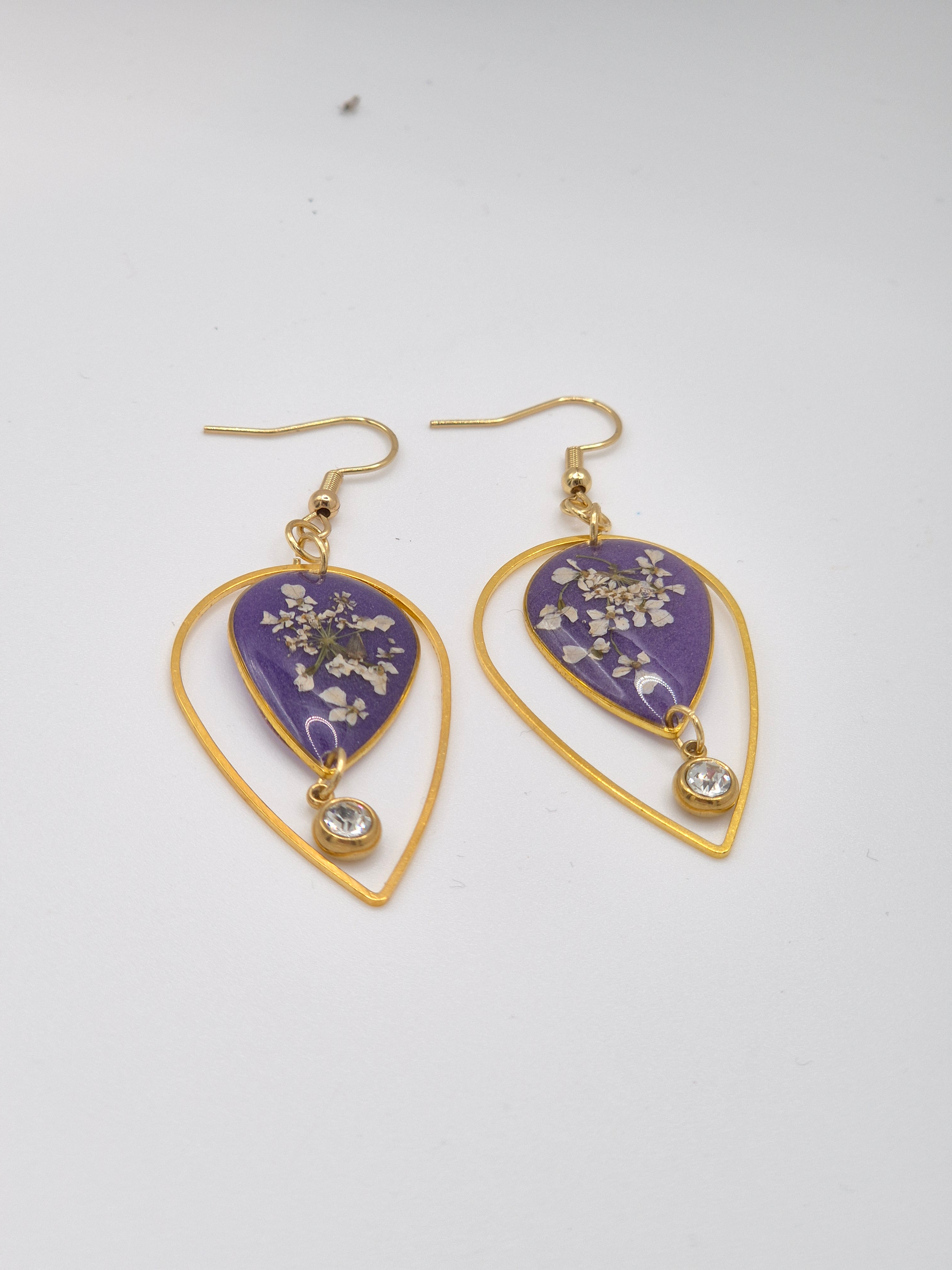 These Cow Parsley flowers set in tear drop shaped bezels with an 18k Gold Plated hook and finished with a stunning complimentary round stone.