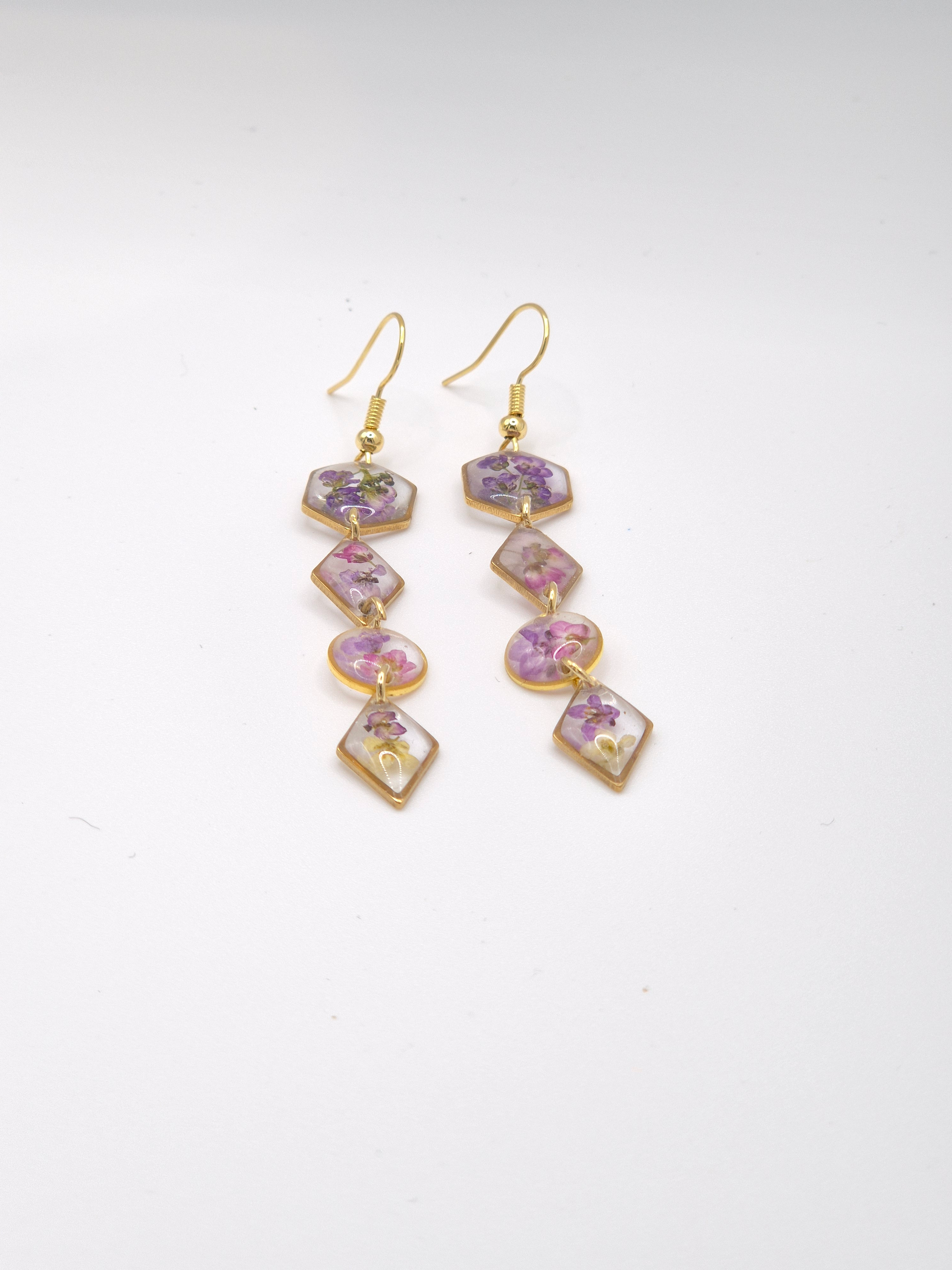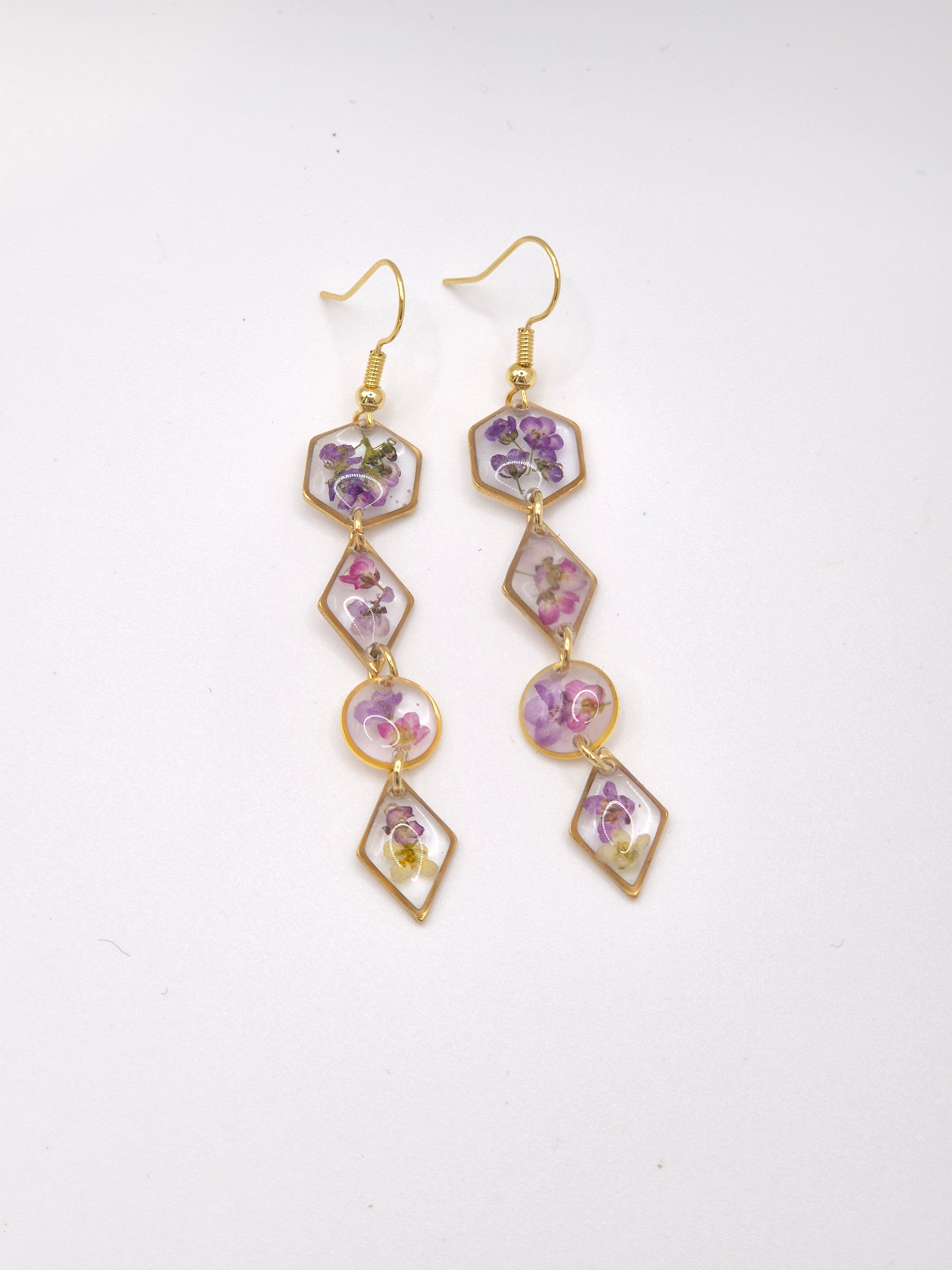 These purple, pink and yellow Alyssums set in various shaped bezels with an 18k Gold Plated hook and finished in a dangle look.
