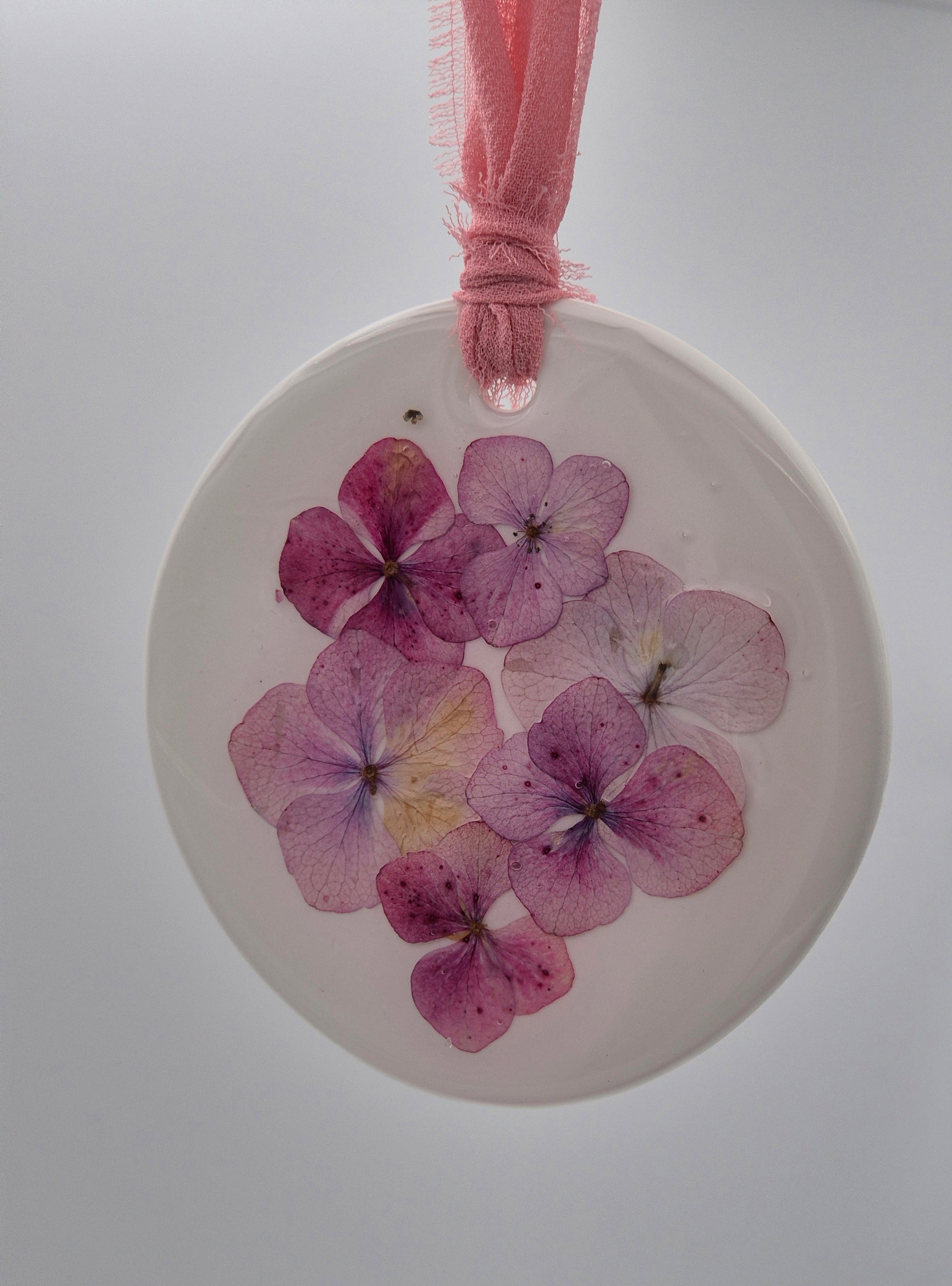 Pink hydrangeas set in resin on a white ceramic ornament and finished with a stunning contrasting chiffon ribbon.