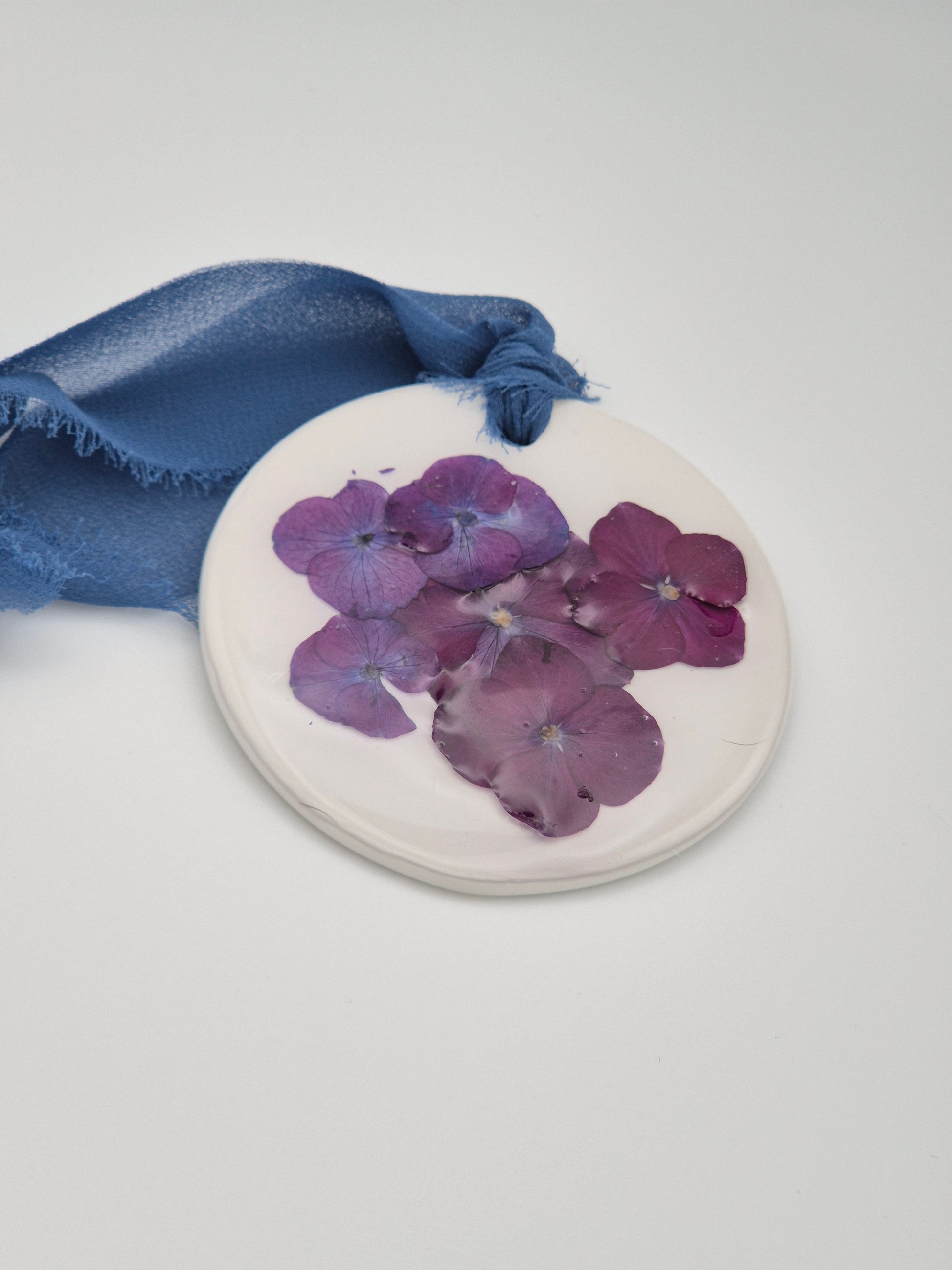 Purple hydrangeas set in resin on a white ceramic ornament and finished with a stunning contrasting chiffon ribbon.