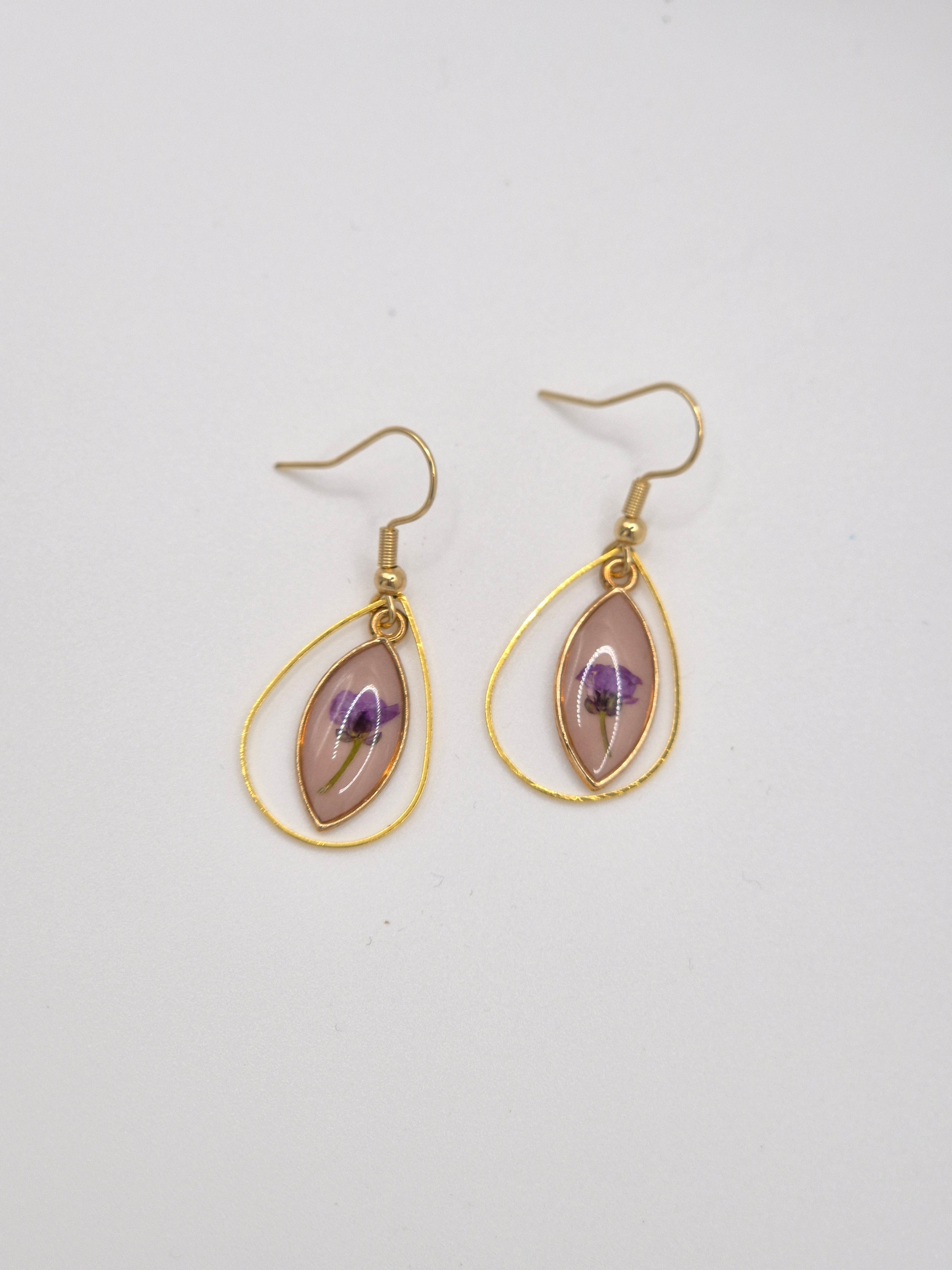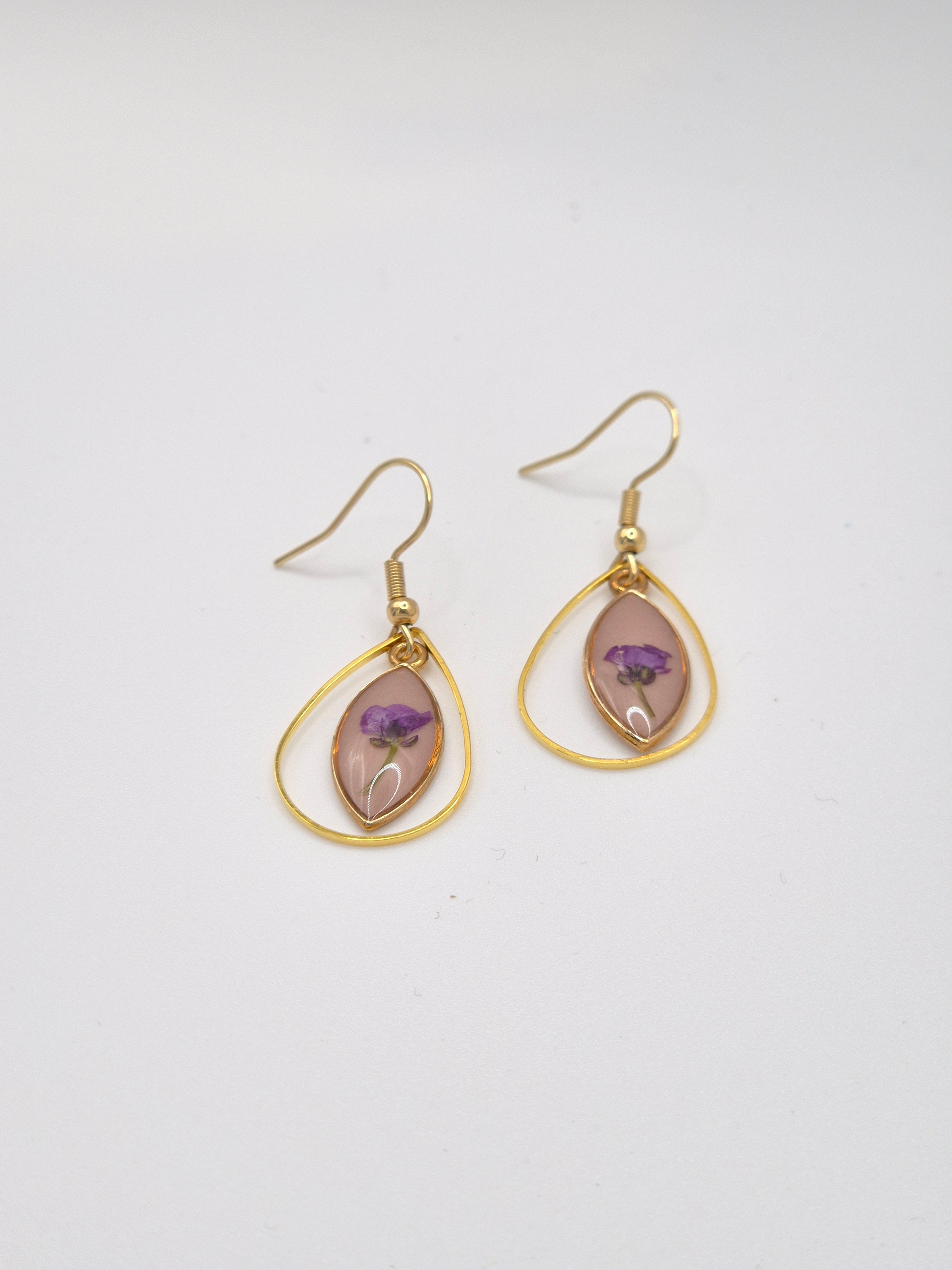 These Alyssum flowers set in olive shaped bezels with an 18k Gold Plated hook and finished with a unique style.